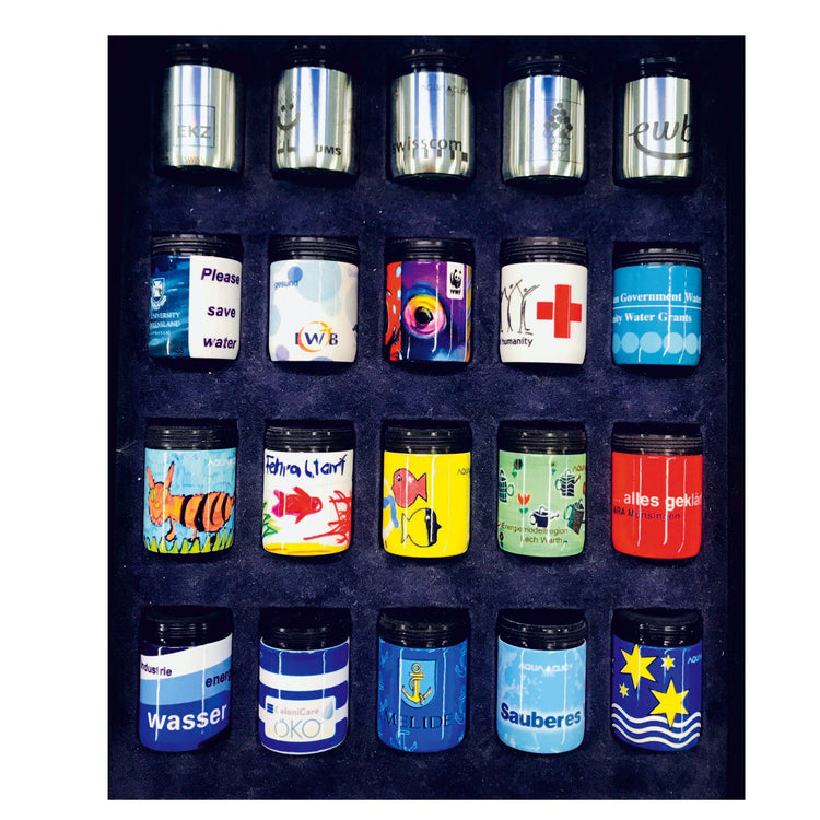 • Inhalt: 20 individuell gestaltete AquaClics in Messing mit Farbbeschichtung und Edelstahl mit schwarzer Gravur.