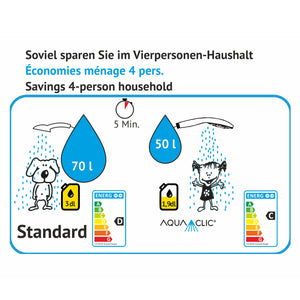 Sparpotential im Vierpersonen-Haushalt Grafik des Wasserverbrauchs: Klassischer Duschkopf neben Sparbrause Variété, die Einsparungen in Litern und Energie wie Heizöl