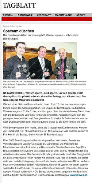 Nachdem die Gravag den Besitzern von Liegenschaften vergünstigte Wärmebild-Aufnahmen angeboten hatte, wollte sie mit der neuen Aktion einen aktiven Beitrag zum Energiesparen und zur Steigerung der Energieeffizienz leisten. Zugleich wollte sie für das Heizen und Warmwasser erwärmen mit Erdgas werben und so auch neue Kunden gewinnen, zugleich aber auch die eigenen Bekanntheit steigern und ihr Image pflegen. 30‘000 Flyer gingen an alle Haushalte im Versorgungsgebiet mit dem Angebot, die AquaClic-Duschbrause zum vergünstigten Preis von 20 Franken zu beziehen. Ihren 8‘000 Kunden offerierte die Gravag die Brause sogar zum halben Preis. Besonders hervorgehoben wurde, dass sich damit der Wasserverbrauch von 15 bis 20 Liter pro Minute auf 6 bis 11 Liter senken lässt, was jährlich die CO2-Emissionen um rund eine Tonne reduziert.