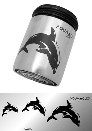 Design: Edelstahl mit springendem Delfin in drei Grössen rund um den AquaClic in dunkler Keramik; AquaClic-Logo, «SwissMade»