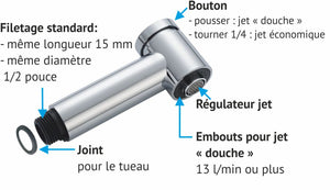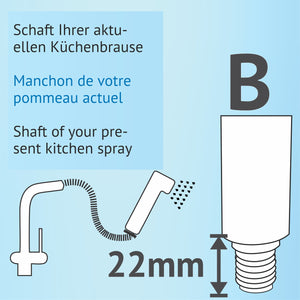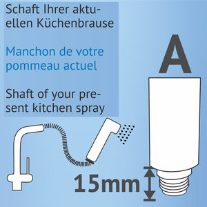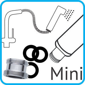 • Adapter, Extradichtungen: für den Ersatz mit der MINI von 2-Strahl-Küchenbrausen an ausziehbarem Schlauch mit Standart-Durchmesser aber längerem Gewinde