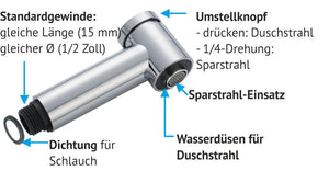 • Wassersparer sind ungeeignet für drucklose Warmwasser-Geräte und beschädigte/ fragile Dusch-Schläuche.