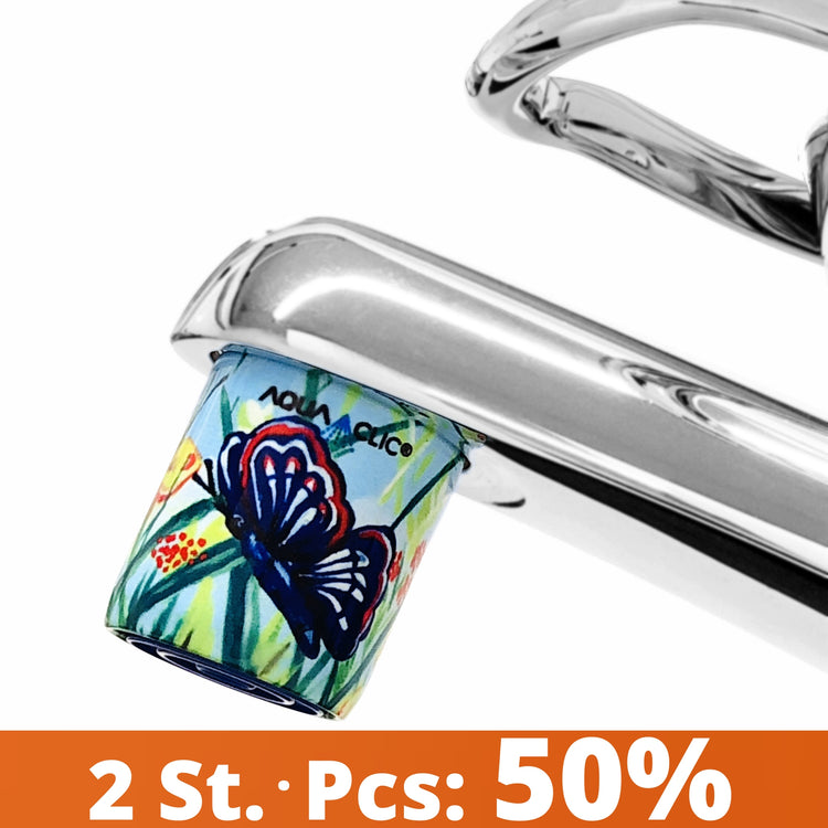 Aéra­teurs AquaClic en inox et en couleur, dont un monté sur un ro­bi­net