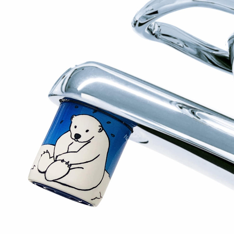 Aéra­teurs AquaClic en inox et en couleur, dont un monté sur un ro­bi­net