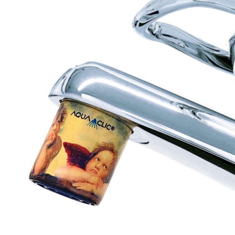 Aéra­teurs AquaClic en inox et en couleur, dont un monté sur un ro­bi­net