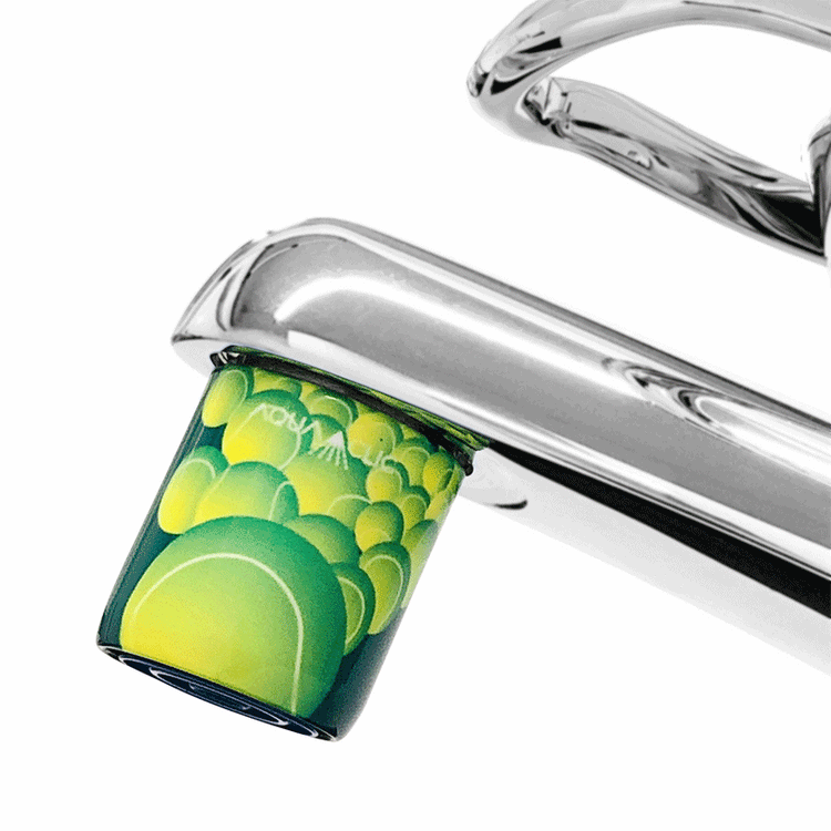 Aéra­teurs AquaClic en inox et en couleur, dont un monté sur un ro­bi­net