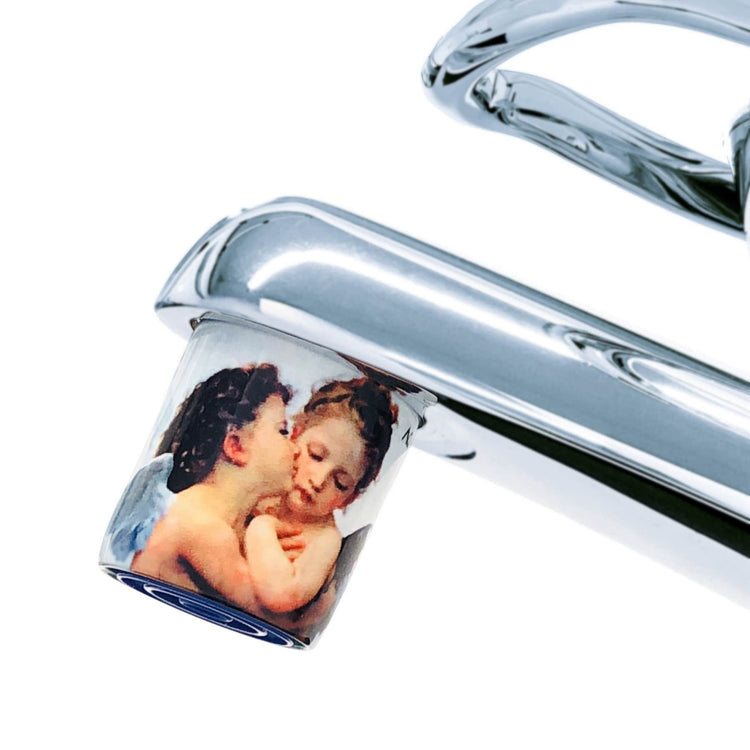 Aéra­teurs AquaClic en inox et en couleur, dont un monté sur un ro­bi­net