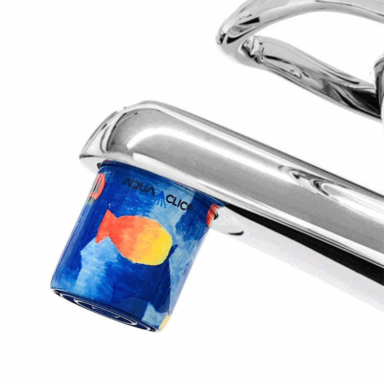 Aéra­teurs AquaClic en inox et en couleur, dont un monté sur un ro­bi­net