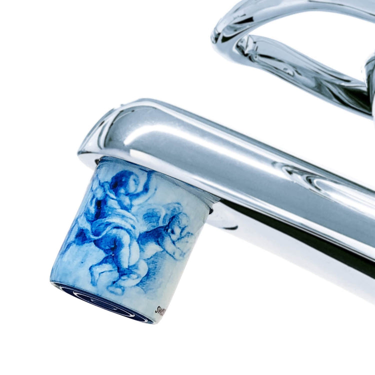 Aéra­teurs AquaClic en inox et en couleur, dont un monté sur un ro­bi­net