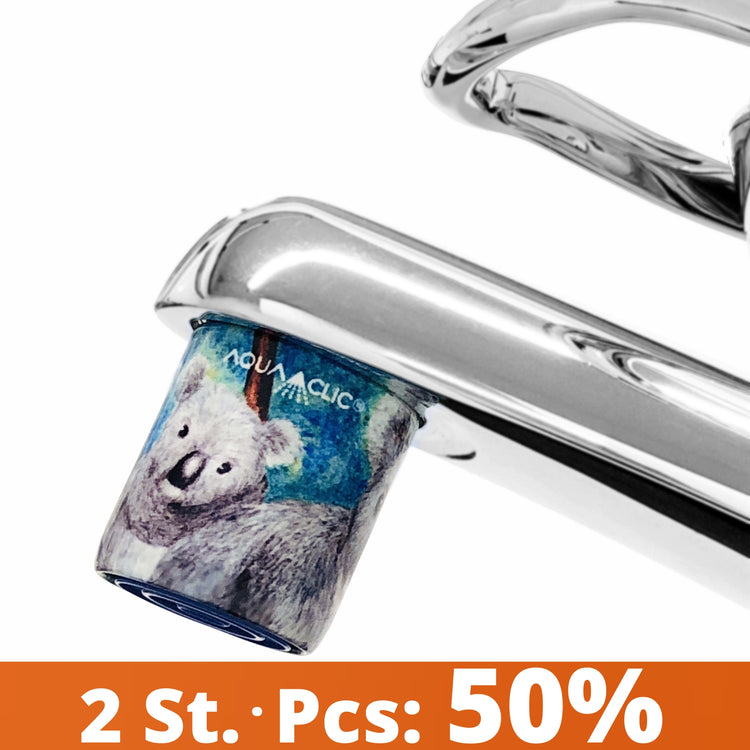Aéra­teurs AquaClic en inox et en couleur, dont un monté sur un ro­bi­net
