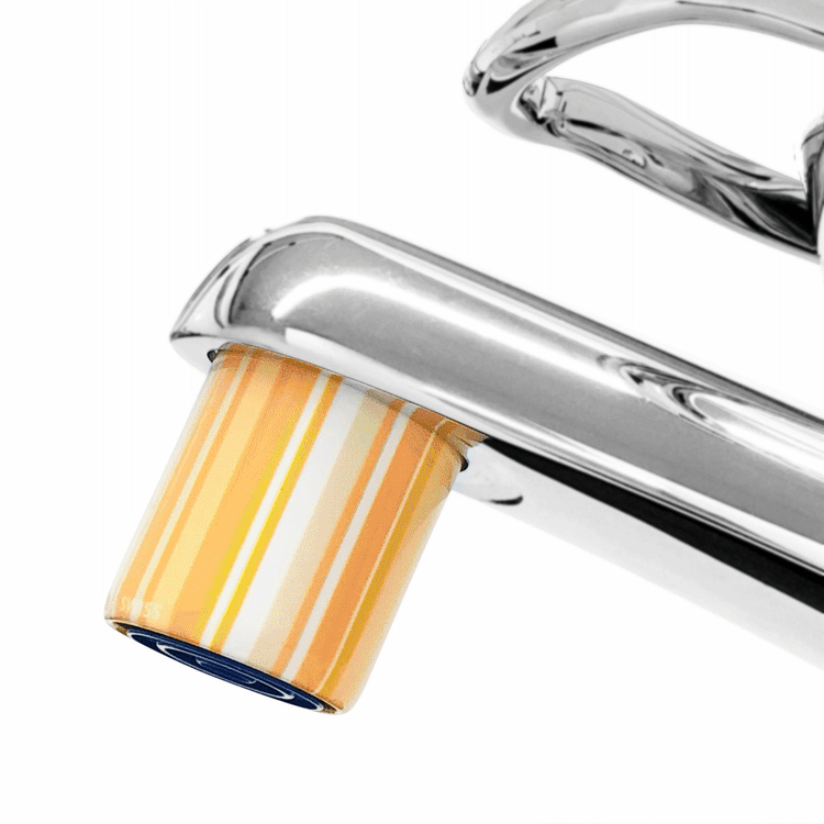 Aéra­teurs AquaClic en inox et en couleur, dont un monté sur un ro­bi­net