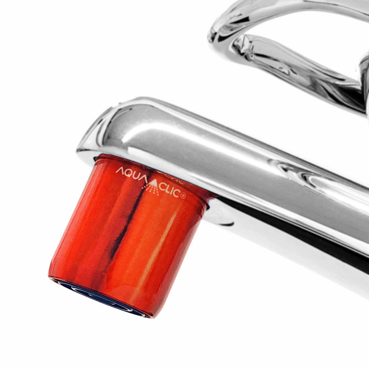 Aéra­teurs AquaClic en inox et en couleur, dont un monté sur un ro­bi­net