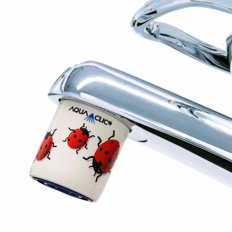 Aéra­teurs AquaClic en inox et en couleur, dont un monté sur un ro­bi­net