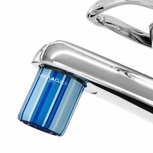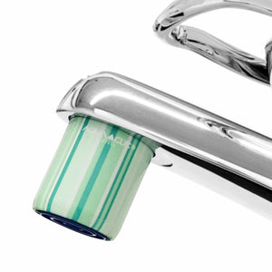 AquaClic Strahlregler Edelstahl und farbig davon einer am Wasserhahn
