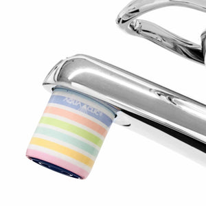 AquaClic Strahlregler Edelstahl und farbig davon einer am Wasserhahn