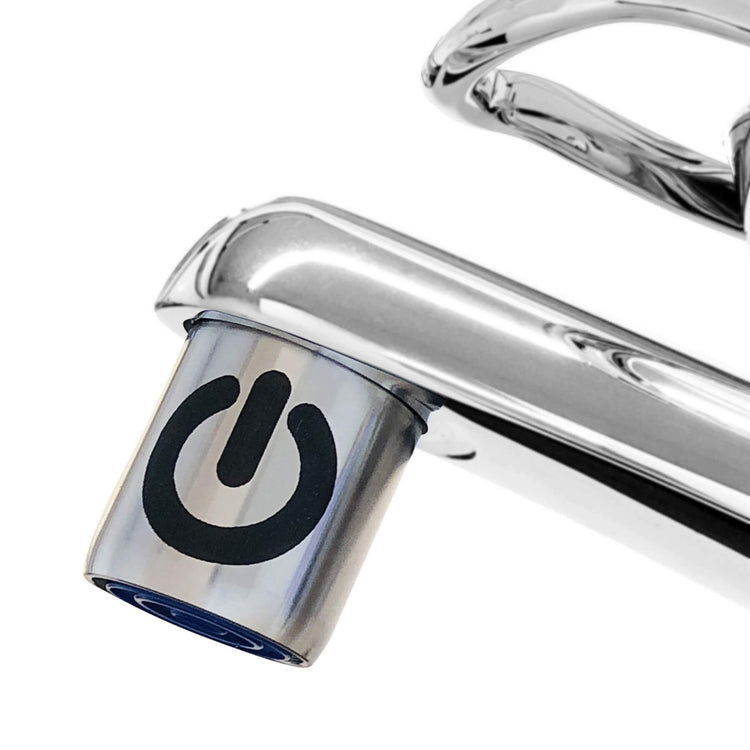 Design: Edelstahl, Energie-Abschaltknopf 1 x umrandet, 1 x schwarz gefüllt, AquaClic-Logo, SwissMade